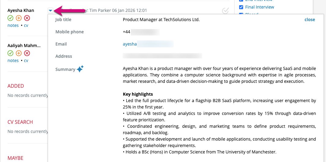 Summaries that have previously been generated on candidate records will also be updated if the candidate applies with an updated CV/Resume.