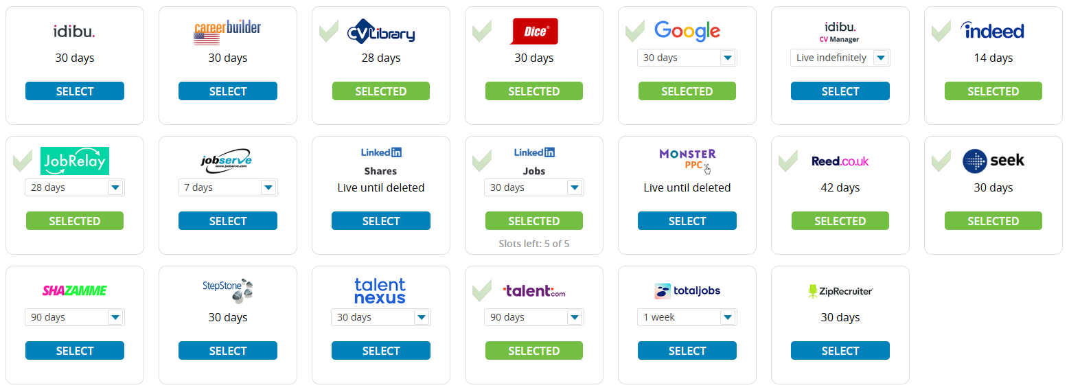 5. Select the boards you wish to post to by clicking on the board icon. You can also adjust the posting period using the drop-down on each board if the job boards allow the option.