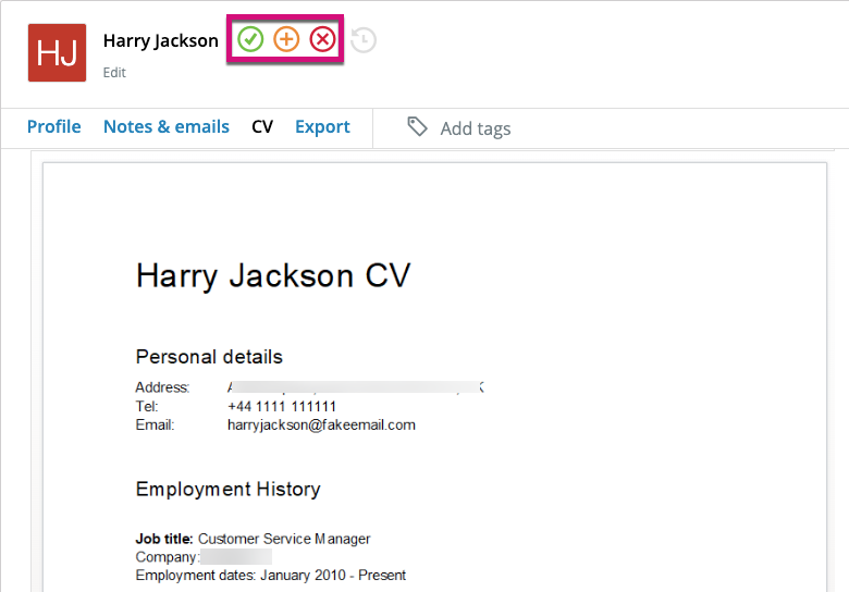 3. If you have assessed that the candidate is not suitable for your role, and you wish to reject them, click the red 'x' icon.