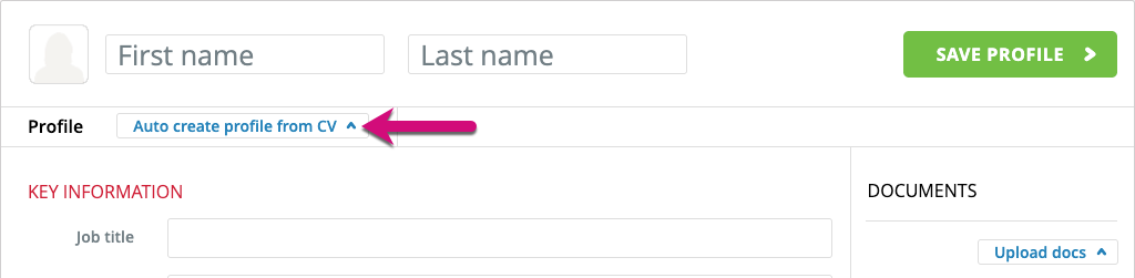 - A blank candidate record will open. Click 'auto create profile from CV', and then select the desired CV from your computer.
