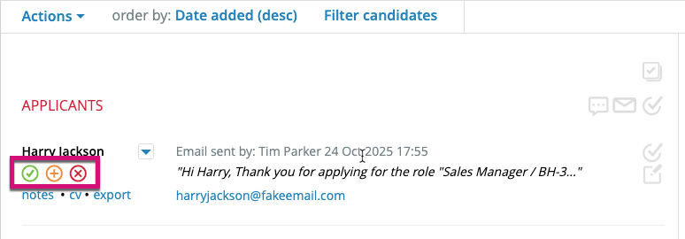 If you have auto-responders set up on your account, an automatic email will be sent to the candidate when you perform any of the three traffic light actions you use to process your applicants