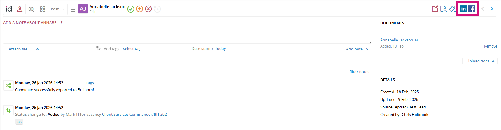 This means that you can get a more holistic view of your candidate by having, for example, their LinkedIn or Facebook profiles linked to their record.