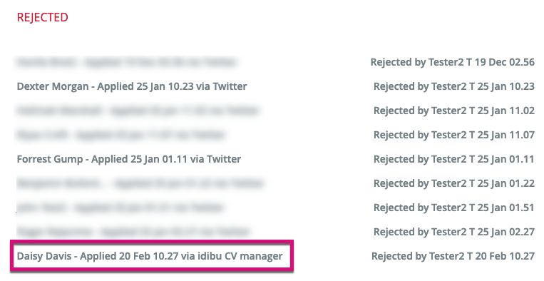 2. Unlike the log for applicants who have been rejected and deleted using the red traffic light, we still display the names of the auto-rejected candidates.