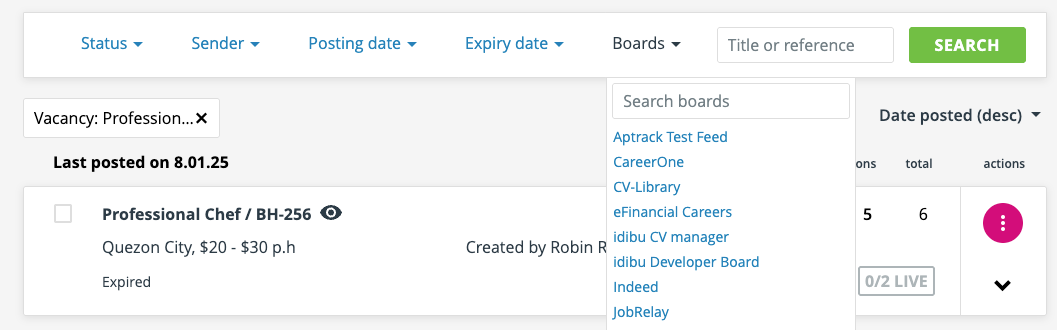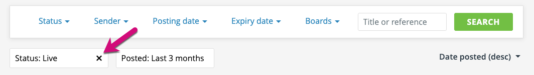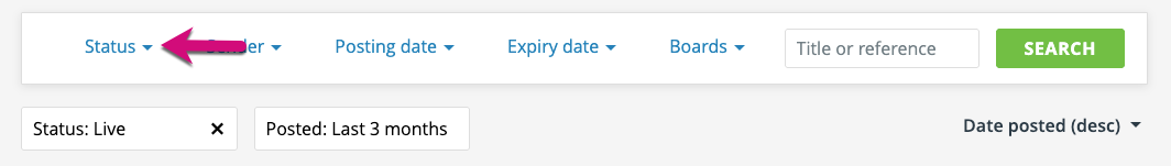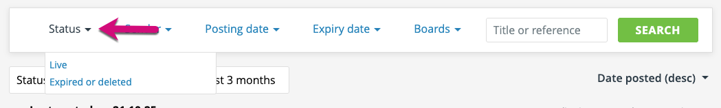 The ‘status’ filter allows you to select either ‘Live’ or ‘Expired or deleted’ adverts.