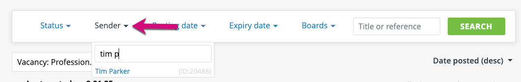 The ‘sender’ filter allows you to view and select the name of any user who is the sender of an advert, either directly from the drop down list or by using the search box to find a specific name.