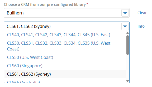 The dropdown list that then appears below allows you to specify the correct Data Centre associated with your Bullhorn account.