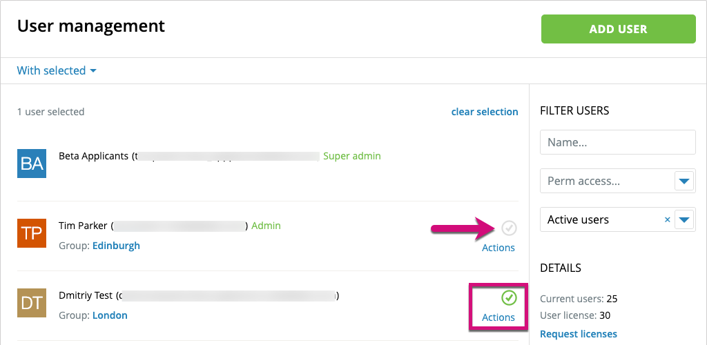 2. Select the users you wish to move by clicking on the grey tick/circle icons on the right. When selected, the icon will turn green.