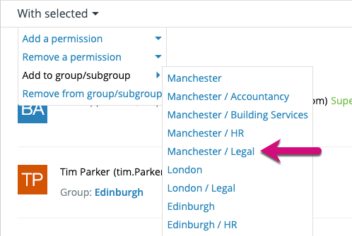 3. A 'With selected' drop down option will appear at the top of the page. Click on this and select 'Add to group/subgroup'.