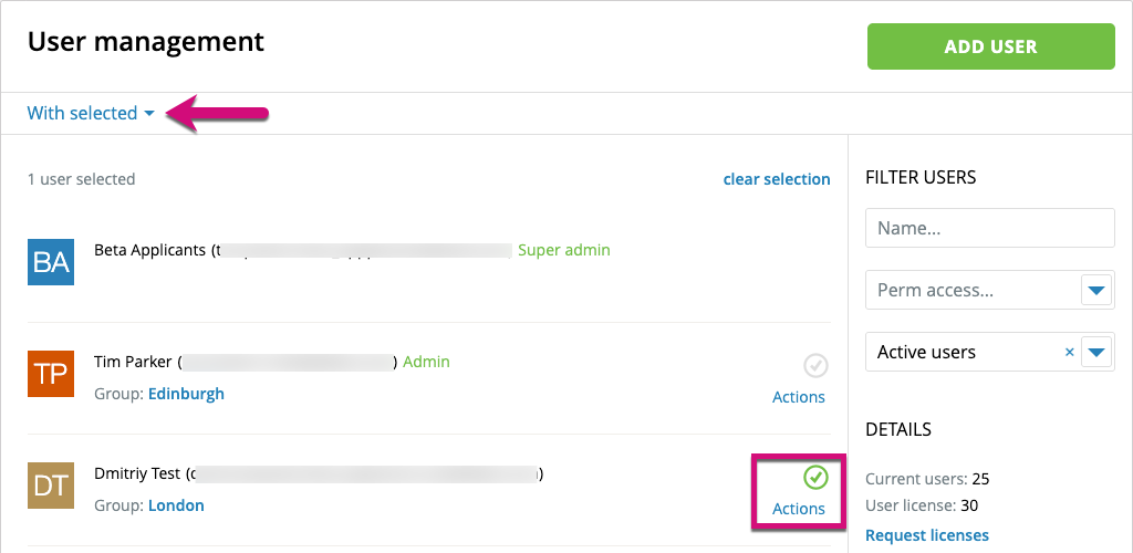 1. Either from the 'All users' list, or inside a Group tab, click the grey tick icons to the right of the users you wish to select.