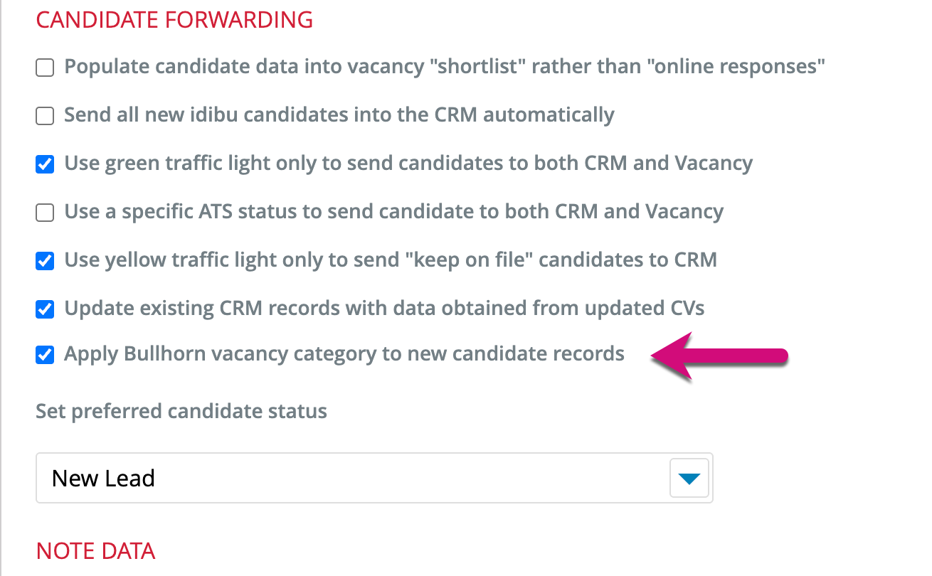To apply the categoris of the Bullhorn vacancy, navigate to 'settings' in your idibu account and open the 'CRM Handoff'. Select the option to 'Apply Bullhorn vacancy category to new candidates'